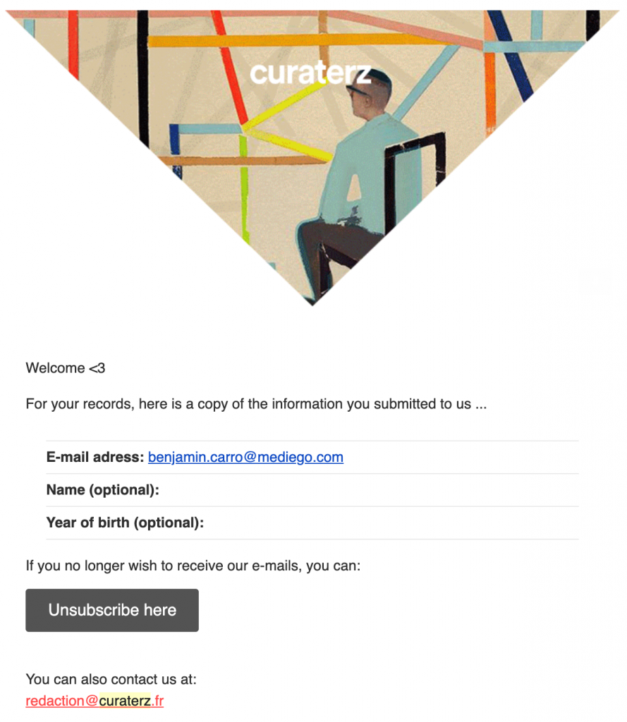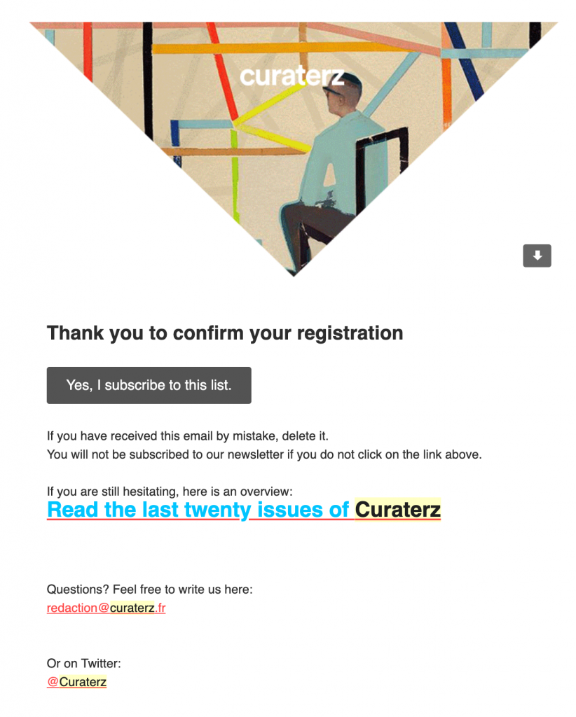 After clicking on the subscription confirmation link, you are redirected to the web confirmation of your registration and Curaterz advises you to add the email address of the editorial office to your address book to ensure that you will receive their future newsletters. Finally, a last email is sent to you to confirm your registration.